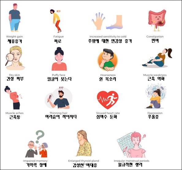 갑상선기능저하증은 증상이 매우 다양하며, 다른 질환에서 나타나는 증상과 매우 유사합니다. 또한 오랜 시간 동안 천천히 진행돼서 갑상선 기능 저하를 초기에 발견하기 어렵습니다.