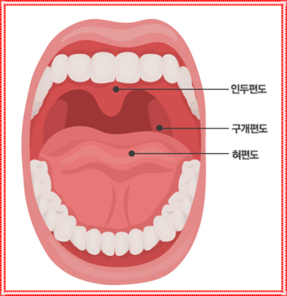 입으로 들어간 병원균은 주로 림프 조직이 구개 편도에 부착하여 감염이 생겨 염증을 일으킵니다.