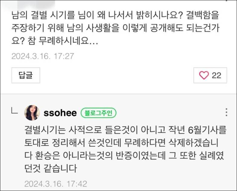블로그에 한 팬은 "잘했어요 소희님, 내 속이 다 시원하네요"라며 "잘 끝냈어요. 회피형 인간 만나봤자 남는 건 숯검정이 마음이다, 다친 거 잘 아물기를 바란다"라고 댓글을 남겼다.