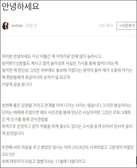 한소희는 자신의 블로그에 결별을 암시하는 듯한 할리우드 배우 니콜 키드먼의 사진 한 장을 올리면서 별다른 설명을 덧붙이지 않았습니다.