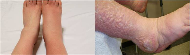 부종이 있는 부위의 피부는 붓고 빨갛게 변할 수 있습니다. 초기에 대개 분홍빛을 띤 적색이 나타나고 약간 따뜻해집니다. 하지만 시간이 지나면서 피부가 두꺼워지고 각화증이 심해지며, 태선화(빼빼로 모양의 표면 구조)가 진행됩니다.
