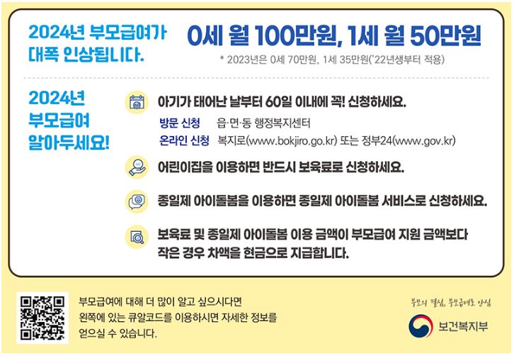 정부는 1월부터 부모급여를 인상해 0세(0~11개월)는 월 70만 원에서 100만 원, 1세(12~23개월)는 34만 원에서 50만 원으로 인상하여 지급합니다.