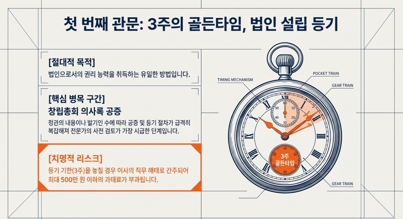 Q3. 등기 기한(3주)을 놓치면 어떻게 되나요? 이사의 직무 해태로 간주하여 최대 500만 원 이하의 과태료가 부과될 수 있습니다. 허가증 수령 즉시 등기를 준비해야 하는 이유이며, 행정적 실수를 방지하기 위해 전문가의 대행이 강력히 권장되는 지점입니다.