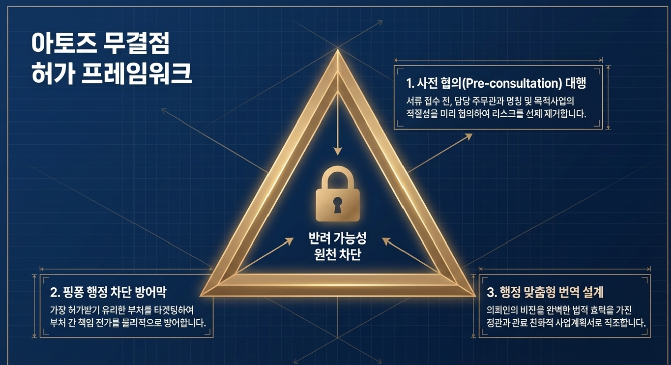목적사업의 우선순위를 조정하여 가장 허가받기 유리한 주무관청을 타겟팅하고, 부처 간 책임 전가를 방어합니다.