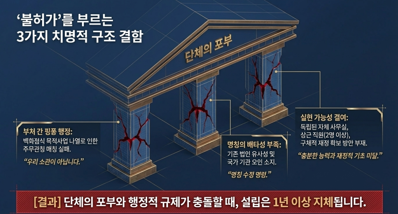 정관의 목적사업은 거창하지만, 이를 실제로 수행할 '독립된 자체 사무실'이나 '상근 직원(일부 관청은 2명 이상 요구)',