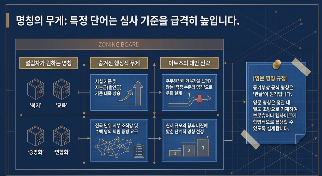 단체의 현재 규모와 향후 비전을 고려하여, 주무관청이 거부감을 느끼지 않는 '적정 수준의 명칭'을 행정사와 상의하여 결정해야 합니다.