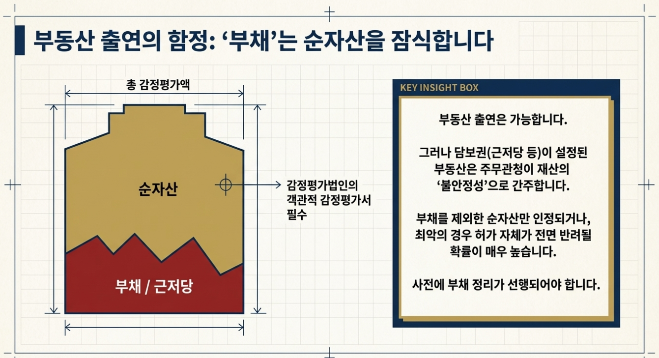 가장 주의할 점은 '부채'입니다. 부동산에 근저당 등 담보권이 설정되어 있다면 주무관청은 재산의 불안정성을 이유로 순자산으로 인정하지 않거나 허가를 반려할 확률이 매우 높으므로 사전에 부채 정리가 선행되어야 합니다