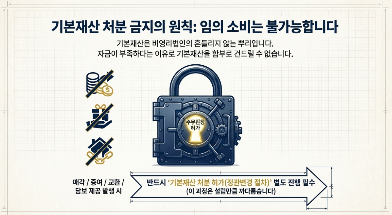 기본재산은 비영리법인의 ‘존립 뿌리’입니다. 원칙적으로 임의 소비가 불가능하며, 만약 자금이 부족해 기본재산을 매각, 증여, 교환하거나 담보로 제공하려면 **반드시 주무관청의 '기본재산 처분 허가(정관변경 절차)'**를 별도로 받아야 합니다