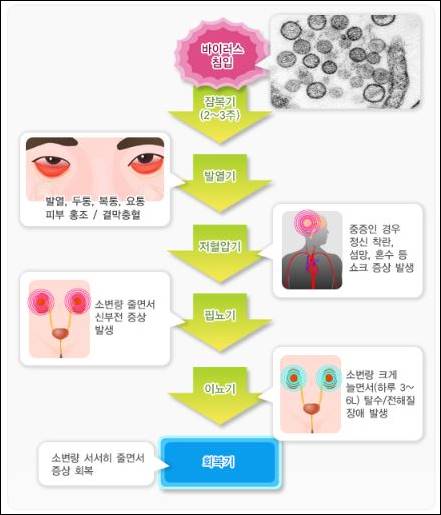 급성으로 발열, 요통과 출혈, 신부전을 초래하는 사람과 동물 모두에게 감염되는 바이러스 감염증이다.