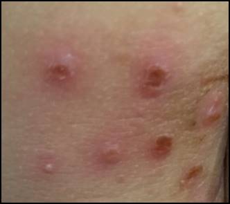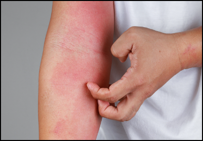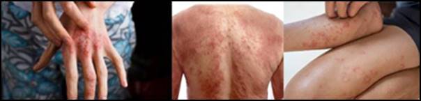 피부에 붉은색이나 갈색의 발진이 생기며, 때로는 수직으로 나타나기도 합니다. 발진은 눈꺼풀, 손목, 발목, 목, 팔꿈치 뒤, 무릎 등 몸의 어디든지 나타날 수 있으며 발진은 감염을 유발할 수 있는 상처로 발전하기도 합니다.