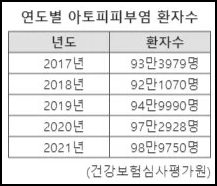 건강보험 심사평가원 자료에 따르면 21년 기준 아토피 피부염 환자는 98만 9750명으로 통계되었습니다. 17년도 이후 4개년 연속 환자수가 늘어나고 있으며 23년에는 100만 명이 넘을 것으로 예상됩니다.