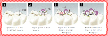 이 찌꺼기들이 플라그를 이루고 있는 세균들에 의해서 분해되면서 산 성분이 나와 치아면을 부식시키기 되어 치아우식증이 발생하게 됩니다.