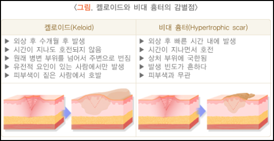 흉터는 정도는 처음 상처에 의해 결정되는 경우가 많지만, 종종 과도하게 흉터가 커지거나 모양이 두드러지기도 합니다.