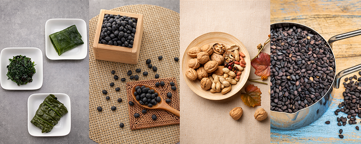 검은깨에 들어 있는 지질 성분이 혈관과 두피에 영양을 공급하며 리놀렌산 등의 불포화 지방산과 아미노산, 철분, 비타민 B1, B2가 풍부해 모발 건강에 좋습니다.