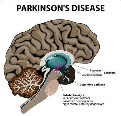 대부분의 뇌의 특정 영역에서 노화 등의 원인으로 인해서 도파민 세포의 손상이나 죽음의 증상이 나타는 것이 원인입니다.