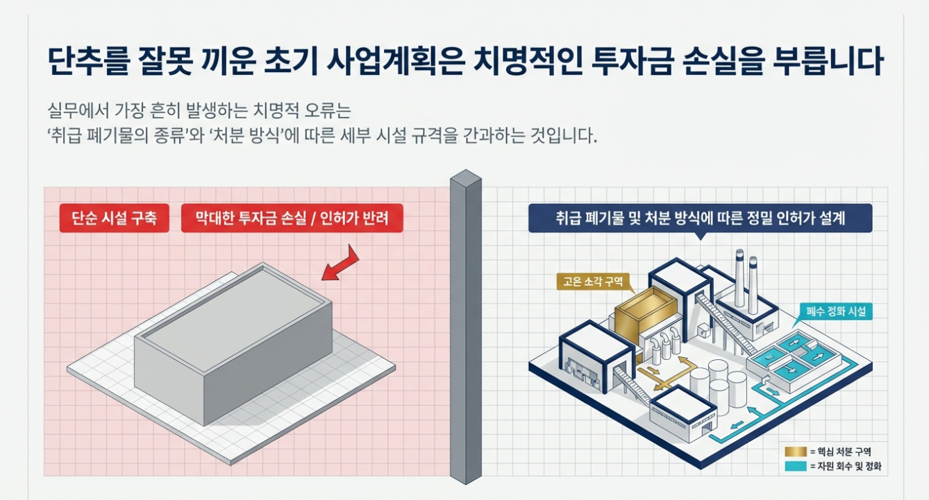 '취급 폐기물의 종류와 처분 방식에 따른 세부 시설 규격'을 단순하게 생각하여 초기 사업계획을 잘못 수립하는 것입니다.