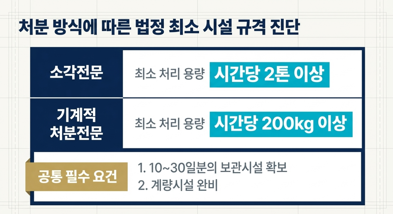처분 방식에 따른 법정 '최소 처리 용량'과 '보관시설'을 반드시 확보해야 합니다.