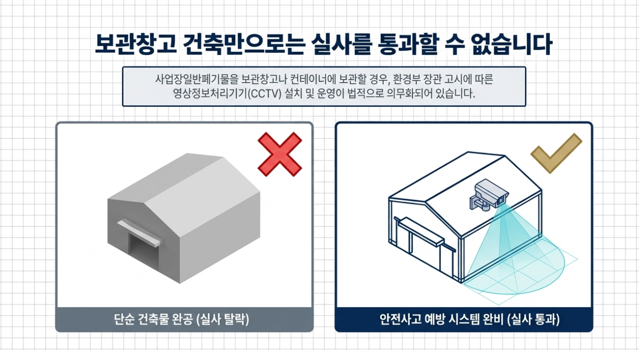 사업장일반폐기물을 보관창고나 컨테이너에 보관하는 경우, 안전사고 예방을 위해 환경부 장관이 고시하는 바에 따라 CCTV를 반드시 설치·운영해야 합니다.