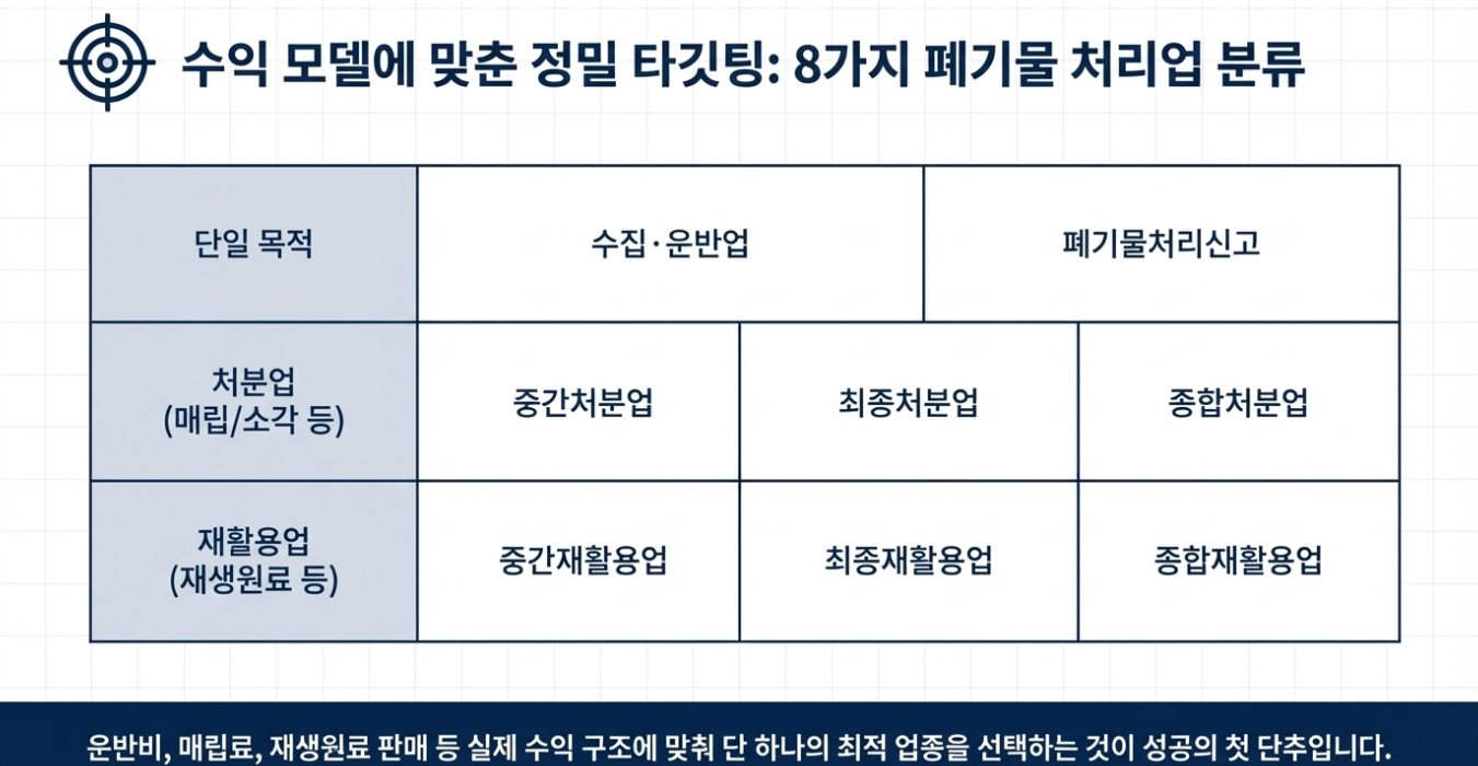 폐기물관리법 시행규칙에 따라 8가지 업종 중 수익 모델에 맞춰 선택해야 합니다.