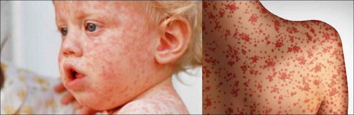 발진은 감염에 노출된 후 14일부터 발진이 얼굴에서 시작하여 몸 전체로 퍼집니다. 발진은 빨간색 반점으로 시작되어 점차 합쳐져 큰 반점으로 변할 수 있습니다.