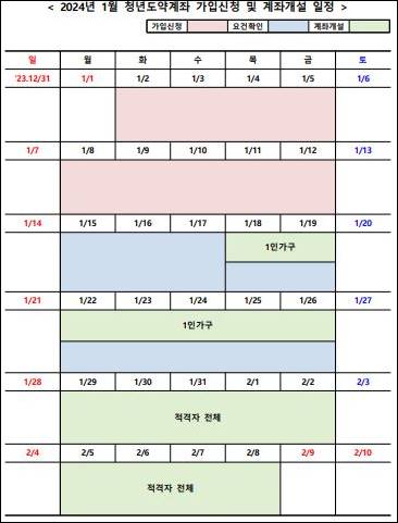 청년도약계좌는 매월 초 신청을 받습니다. 2024년 1월의 신청기간은 1월 2일부터 12일까지입니다. 가입신청 후에는 가입 요건을 확인하는 기간이 있는데 1인 가구는 가족들의 소득확인이 필요하지 않아서 1월 18일부터 계좌개설이 가능합니다. 1인 가구가 아닌 경우는 1월 29일부터 계좌 가설이 가능합니다.