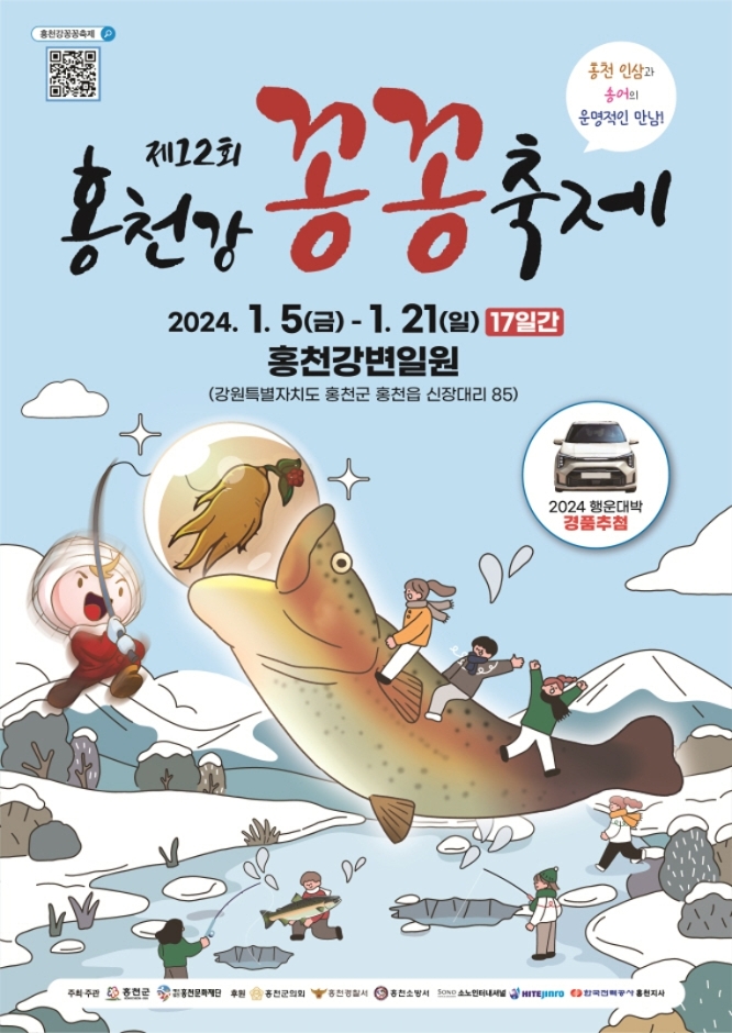매년 겨울 인삼 송어와 함께하는 홍천강 꽁꽁 축제가 강원도 홍천에서 펼쳐집니다. 남녀노소 손쉽게 즐길 수 있는 얼음낚시와 맨손으로 잡는 맨손송어 잡기 그리고 눈으로 보고 낚시를 할 수 있어 아이들에게 인기 있는 가족 실내 낚시터까지 있습니다.
