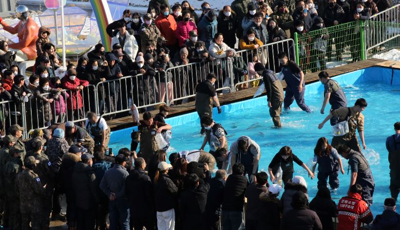 4. 행사장에 뛰어들어 산천어를 잡는다.