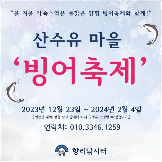 제6회 양평 산수유마을 빙어축제를 개최합니다. 도시에서 경험하기 힘든 추억의 얼음설매는 물론 광활한 저수지가 꽁꽁 얼어 그 위에 올라 구멍 뚫어 빙어 낚시를 즐길 수 있습니다.