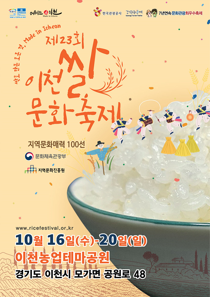 이천 쌀 문화축제는 우리나라 주식이며 전국 최고의 미질을 자랑하는 이천의 대표적인 특산물인 쌀을 주제로 열리는 종합 문화 관광축제입니다. 어린 세대가 전통 농경문화를 체험할 수 있고 어른들에게는 옛 향수를 자아내는 축제의 한마당으로 다양하고 재미있는 각종 행사가 열립니다.