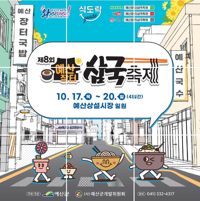 제8회 예산 장터 삼국 축제는 국화 국밥 국수를 콘텐츠로 하는 예산군 대표축제로 올해는 음식문화축제와 친환경을 중심으로 방문객들에게 예산군의 식도락 여행을 안내하는 가이드로서의 역할을 담당하고자 한다.