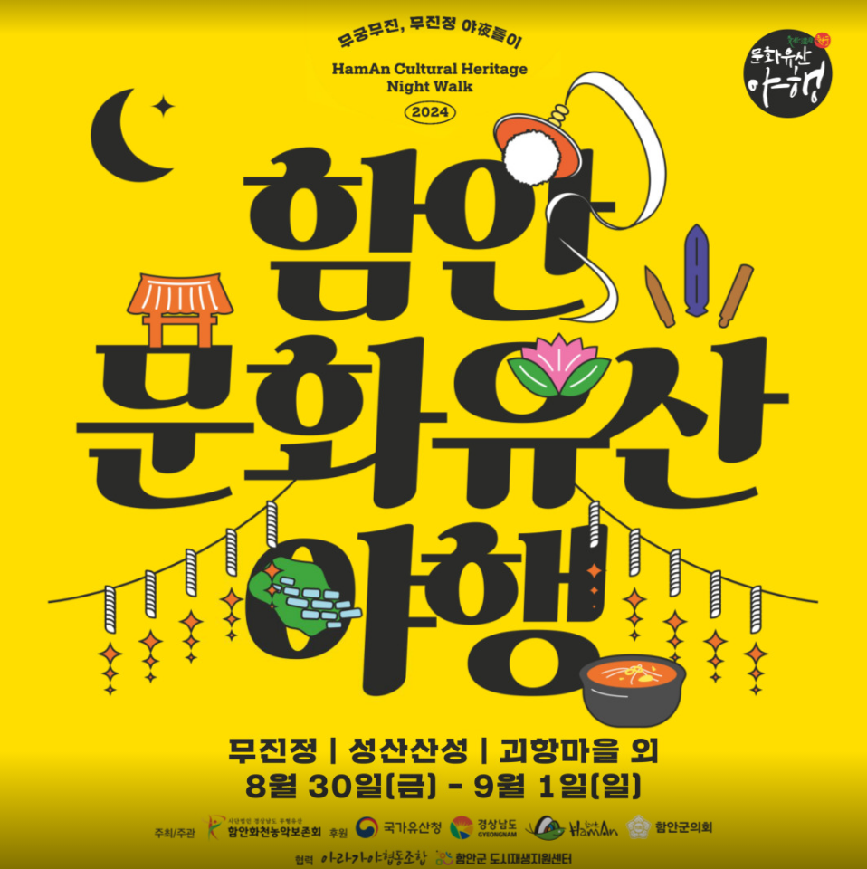 함안의 문화유산 무진정에서 “예(藝)단법석”의 전통 가곡을 볼 수 있으며, 함안의 역사로 만드는 특별한 체험 “소곤소곤 함안 역사이야기”, 함안 지역의 특색 있는 굿즈 마켓 “무진場”, 함안의 짬뽕과 청년 먹거리 골목 “무진장 먹거리 장터”, 함안 낙화와 문화유산 사진&그림 전시전 “달빛에 비춰보는 함안”, 무궁무진 차박 캠핑 “무진원(院)”등 하나라도 바뜨릴 수 없는 프로그램으로 함안문화유산야행에서만 만날 수 있습니다.
