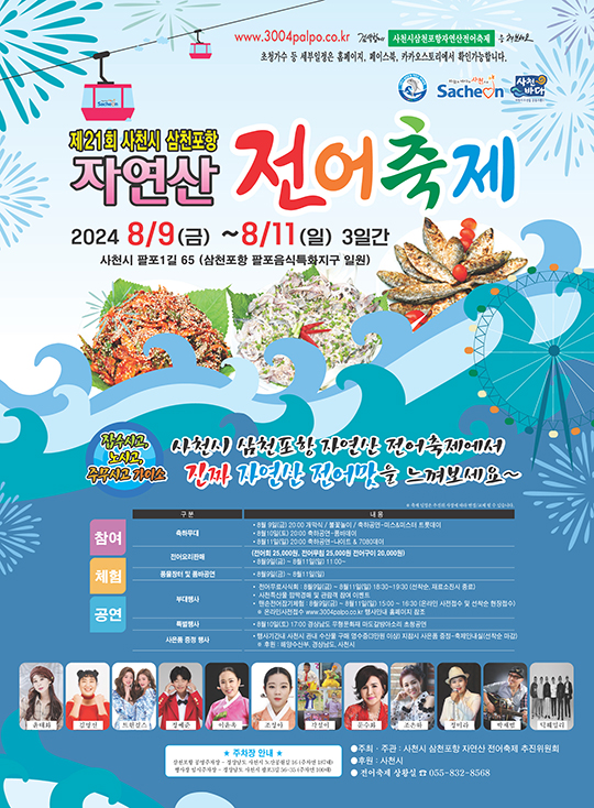 금년 2024년에『제21회 사천시 삼천포항 자연산 전어축제』라는 타이틀로 전어 풍어기에 맞추어서 명성 높은 사천시 전어 맛을 전국에 알리고, 또한 지역 어민 및 수산업과 수산 관련업에 종사하시는 시민들의 소득증대와 더 나아가 깨끗한 청정해역 사천시와 사천시의 수산물을 알리고자 전어축제를 개최합니다.