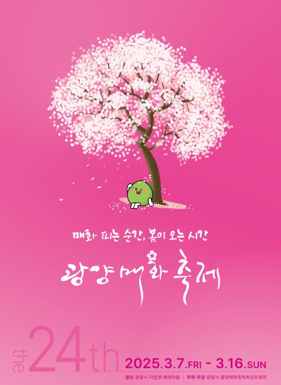 올해로 제24회를 맞는 광양매화축제는 오는 3월 7일부터 16일까지 한국의 봄, 광양매화마을에서 열다라는 주제와 매화 피는 순간, 봄이 오는 시간을 슬로건 아래 차별화되고 매력적인 콘텐츠가 준비되어 있습니다.