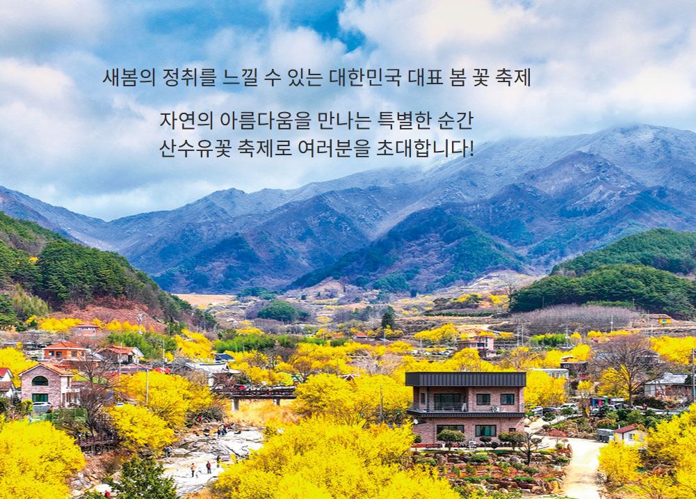 새봄의 정취를 느낄 수 있는 대한민국 대표 봄꽃축제입니다. 산수유꽃은 3월에 다른 꽃보다 먼저 개화해 봄 소식을 전합니다.