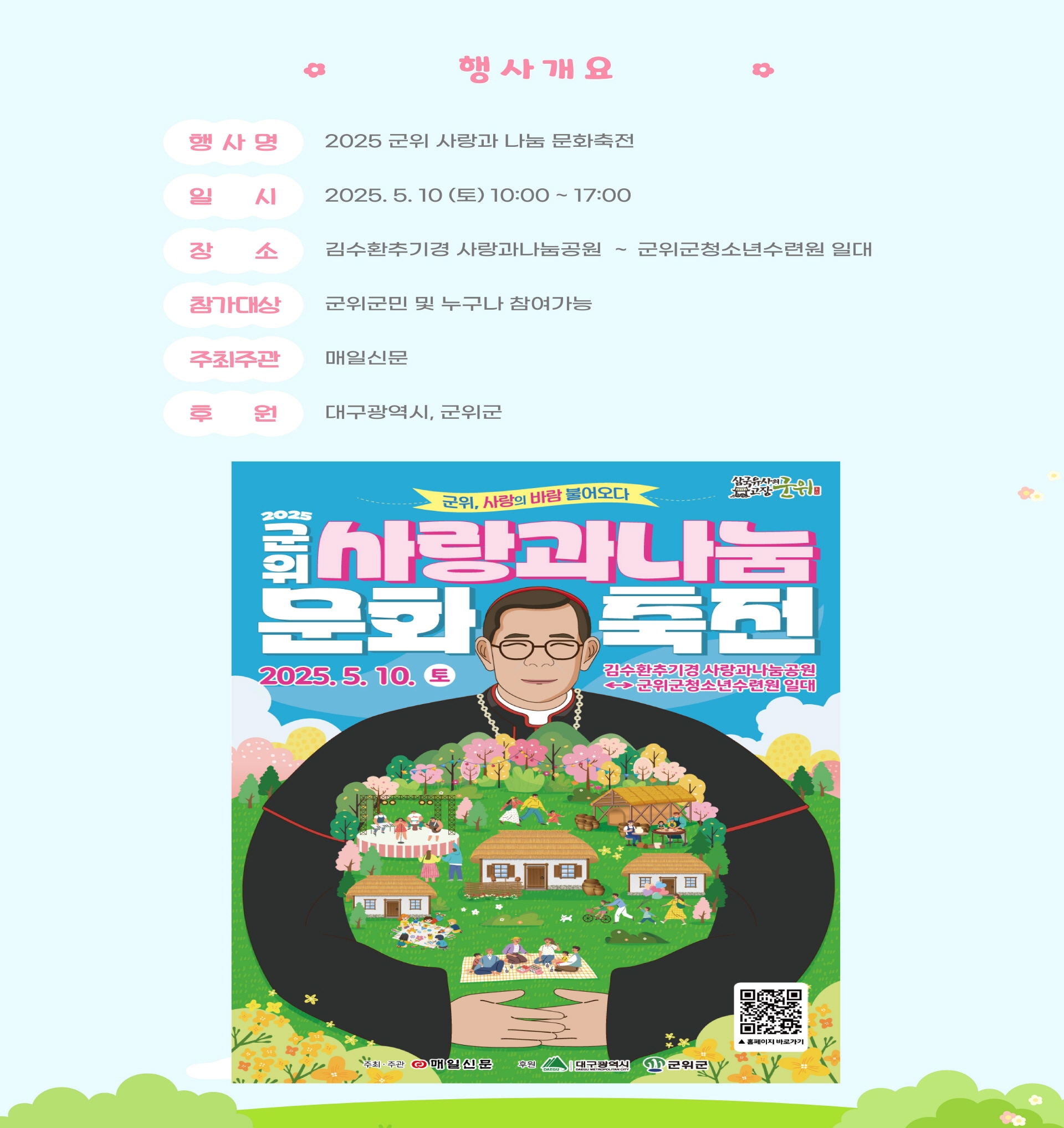 가정의 달 5월, ‘군위 사랑과 나눔 문화축전’은 김수환 추기경 사랑과나눔공원, 용대리 마을, 군위군청소년수련원 일원에서 열리는 가족 참여형 문화축제입니다.
