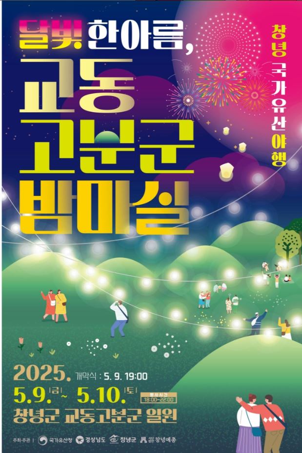 창녕의 역사와 문화를 감성적으로 풀어낸 축제로, 야경·야로·야설·야사·야화·야시·야식·야숙 등 8야(夜) 24개 프로그램을 선보입니다. 행사는 2025년 5월 9일(금)~10일(토), 18:00 ~ 22:00 창녕박물관 및 교동고분군 일대에서 개최됩니다.