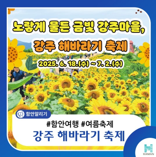 18일 오전 11시 축제 시작을 알리는 개막행사를 시작으로 공연과 농특산물 판매, 먹거리마당 등이 다채롭게 펼쳐지며, 강주마을 일원에서 열리는 강주해바라기 축제는 식재면적 총 4만 2,500㎡ 규모 내 해바라기와 백일홍, 이색 박터널이 방문객을 맞이합니다.