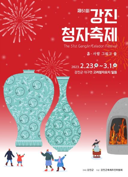 강진청자축제는 1973년 금릉문화제, 1996년 청자문화제에 뿌리를 두고 있으며 2009년 강진청자축제로 이름을 바꿔 전남의 축제로 자리 잡았습니다.  새롭게 겨울로 옮겨 개최하고 많은 관광객들에게 화목가마 장작패기, 청자성형물레체험, LED소원풍등 날리기, 눈썰매장 등 다양한 볼거리와 즐길거리를 체험할 수 있습니다.