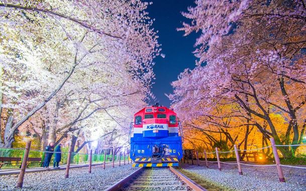 36만 그루 벚나무가 개화가 되면 벚꽃의 향연에 빠질 수 있습니다. 진해 군항제 시기 진해는 도시 전체가 벚꽃 천국이며, 그중 '로망스다리'로 알려진 여좌천의 1.5km 구간의 개천을 따라 늘어선 벚꽃나무가 일제히 꽃망울을 터뜨려 하늘을 뒤덮으며 절경을 이룹니다.