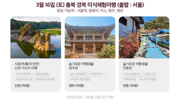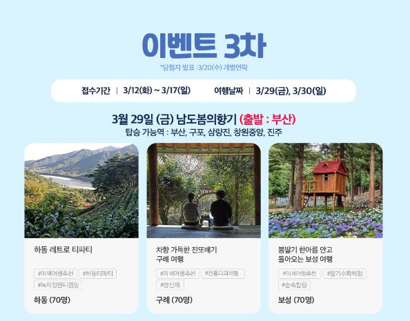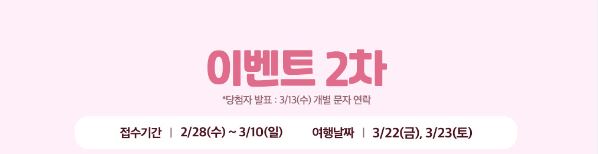 - (여행일시) 3. 8.(금) / 3. 15.(금) / 3. 16.(토) / 3. 22.(금) / 3. 23.(토) / 3. 29.(금) / 3. 30.(토)
