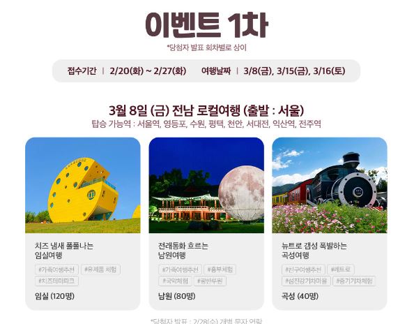 ‘3월 여행가는 달’은 비수도권 지역여행 위주로 교통과 숙박, 여행상품에 대한 대규모 할인 혜택을 제공하고, 3만 원으로 당일 기차여행을 즐길 수 있는 특별 행사도 진행해 합리적인 가격으로 다채로운 지역여행의 매력을 경험할 수 있도록 구성하였습니다.