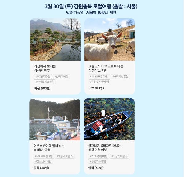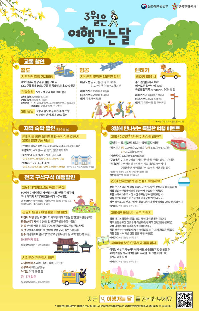 ‘3월 여행가는 달’은 비수도권 지역여행 위주로 교통과 숙박, 여행상품에 대한 대규모 할인 혜택을 제공하고, 3만 원으로 당일 기차여행을 즐길 수 있는 특별 행사도 진행해 합리적인 가격으로 다채로운 지역여행의 매력을 경험할 수 있도록 구성하였습니다.