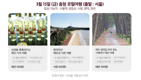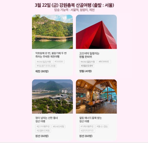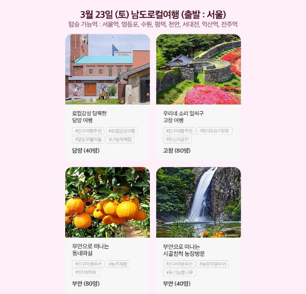 - (여행일시) 3. 8.(금) / 3. 15.(금) / 3. 16.(토) / 3. 22.(금) / 3. 23.(토) / 3. 29.(금) / 3. 30.(토)