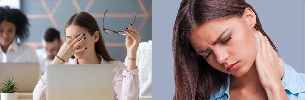 이러한 증상은 주로 장시간 동안 컴퓨터 화면을 바라보고 작업하는 사람들에게 나타나며, 눈의 피로, 두통, 목과 어깨의 통증, 팔과 손의 통증, 무기력, 안구건조증, 안구염증 및 다른 증상을 포함할 수 있습니다.